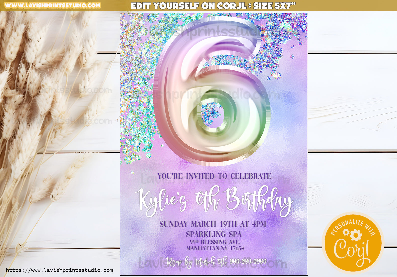 6th Birthday Invitation Glitter Sixth Birthday Invitation Template Editable Girls Invitation Editable Glitter Birthday Party