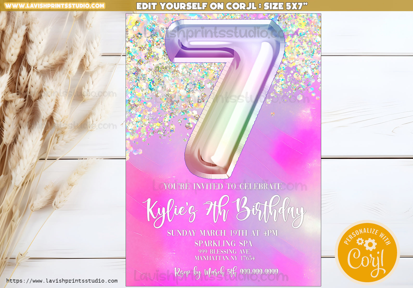 7th Birthday Invitation Glitter Seventh Birthday Invitation Template Editable Girls Invitation Editable Glitter Birthday Party