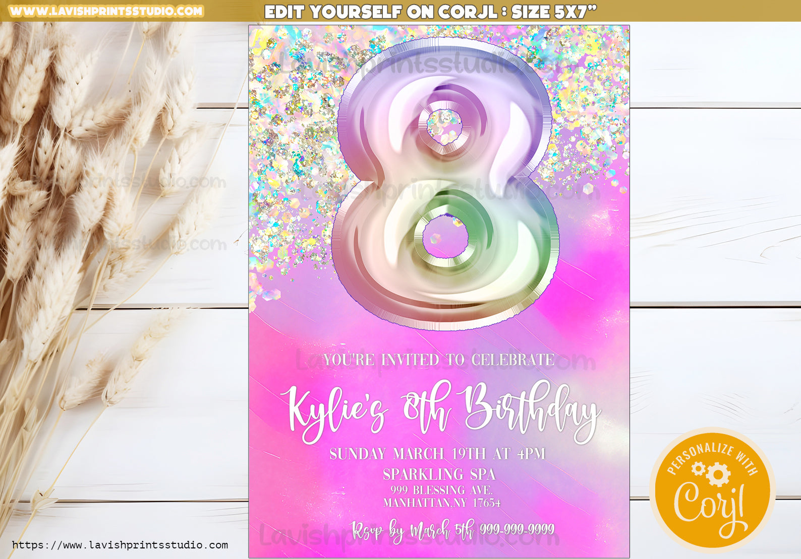 8th Birthday Invitation Glitter Eighth Birthday Invitation Template Editable Girls Invitation Editable Glitter Birthday Party
