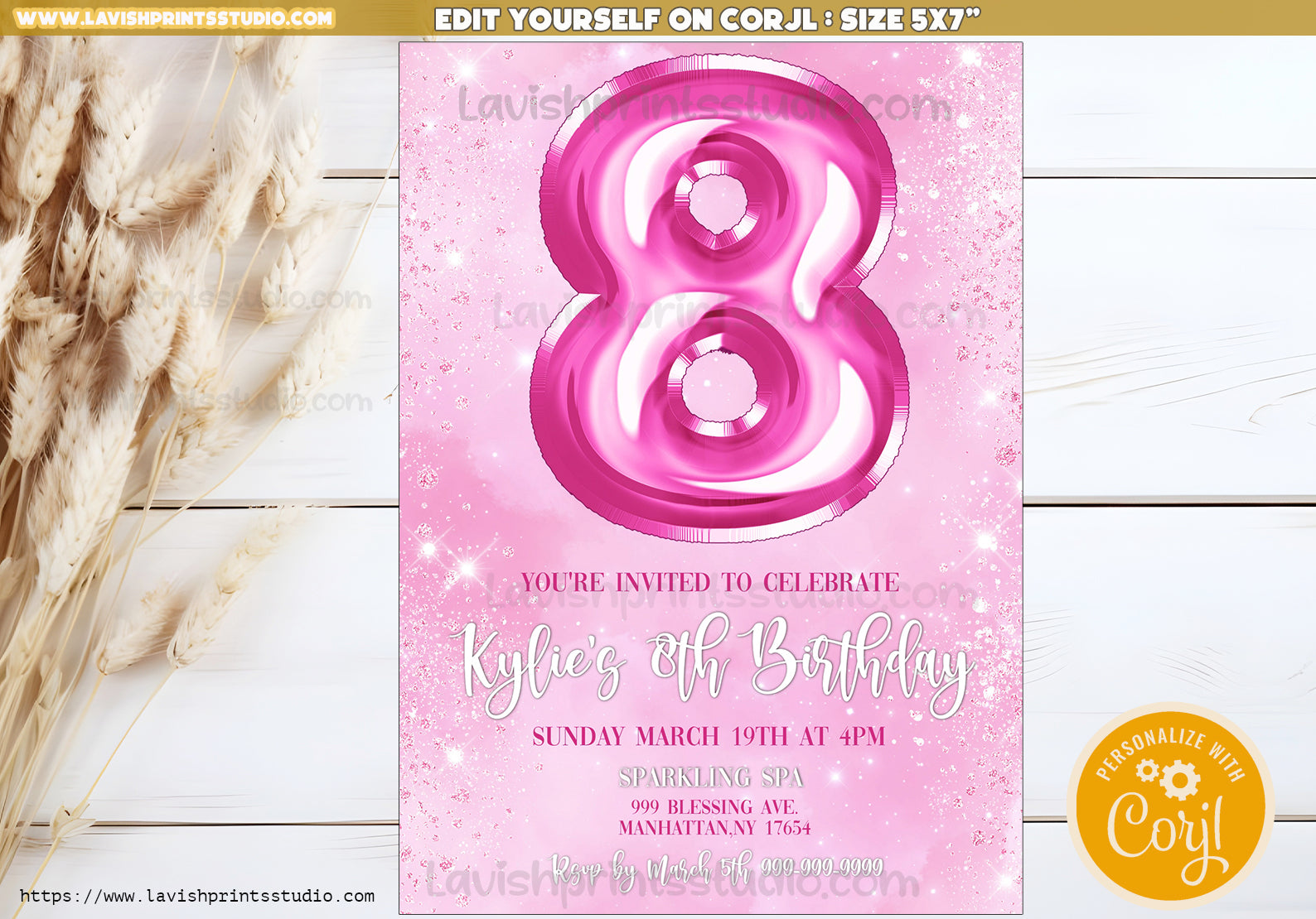8th Birthday Invitation Glitter Eighth Birthday Invitation Template Editable Girls Invitation Editable Glitter Birthday Party